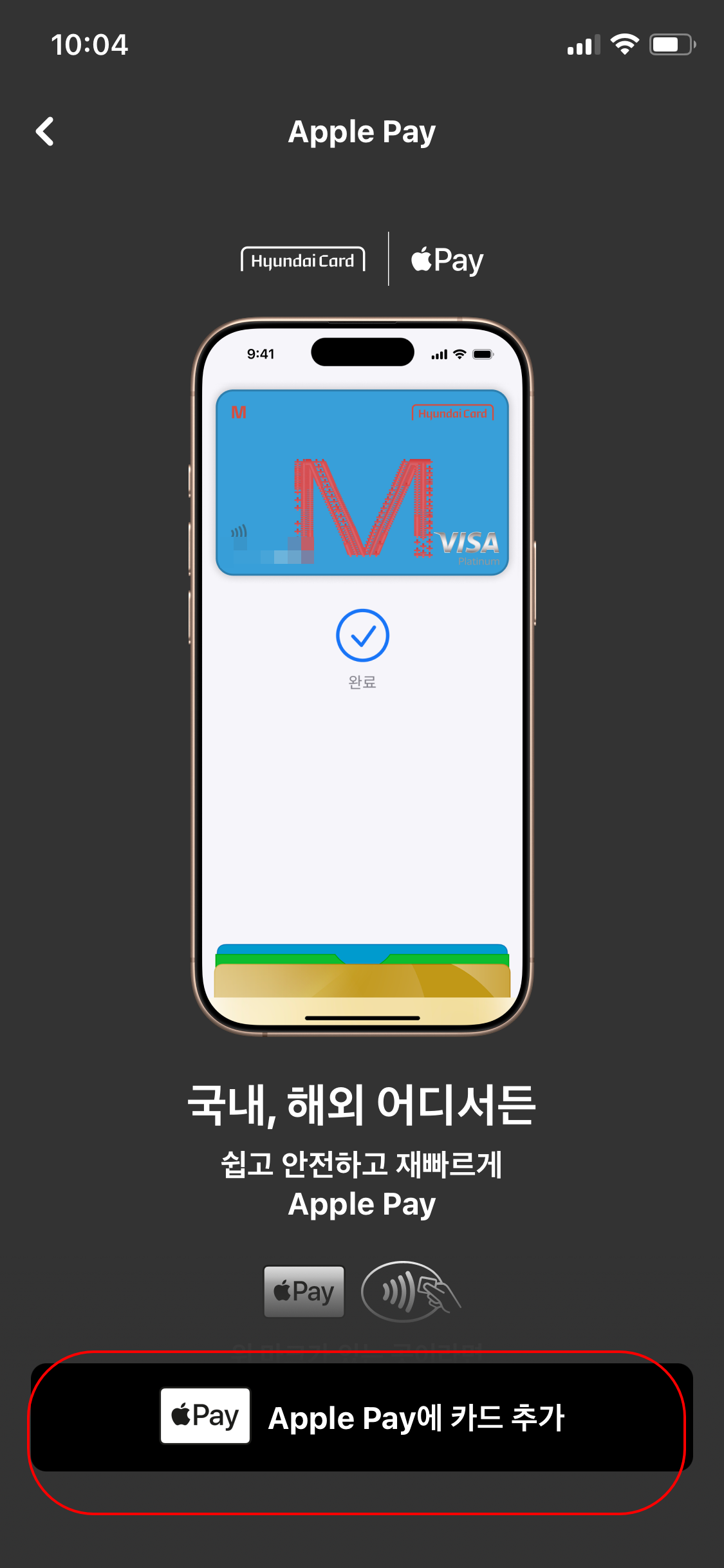 카카오페이에서 이벤트로 현대카드 발급 신청하고 (20만원사용시 20만원 캐시백), 드디어 현대카드를 받았습니다. 대리인이 수령했기 때문에 카톡으로 온 수령 등록을 해줍니다. 그러면 바로 사용이 가능한데, 필자는 아이폰을 사용하고 있으므로 애플페이에 등록해서 사용하려 합니다. 그럼 애플페이에 카드 등록을 함께 해봅니다.