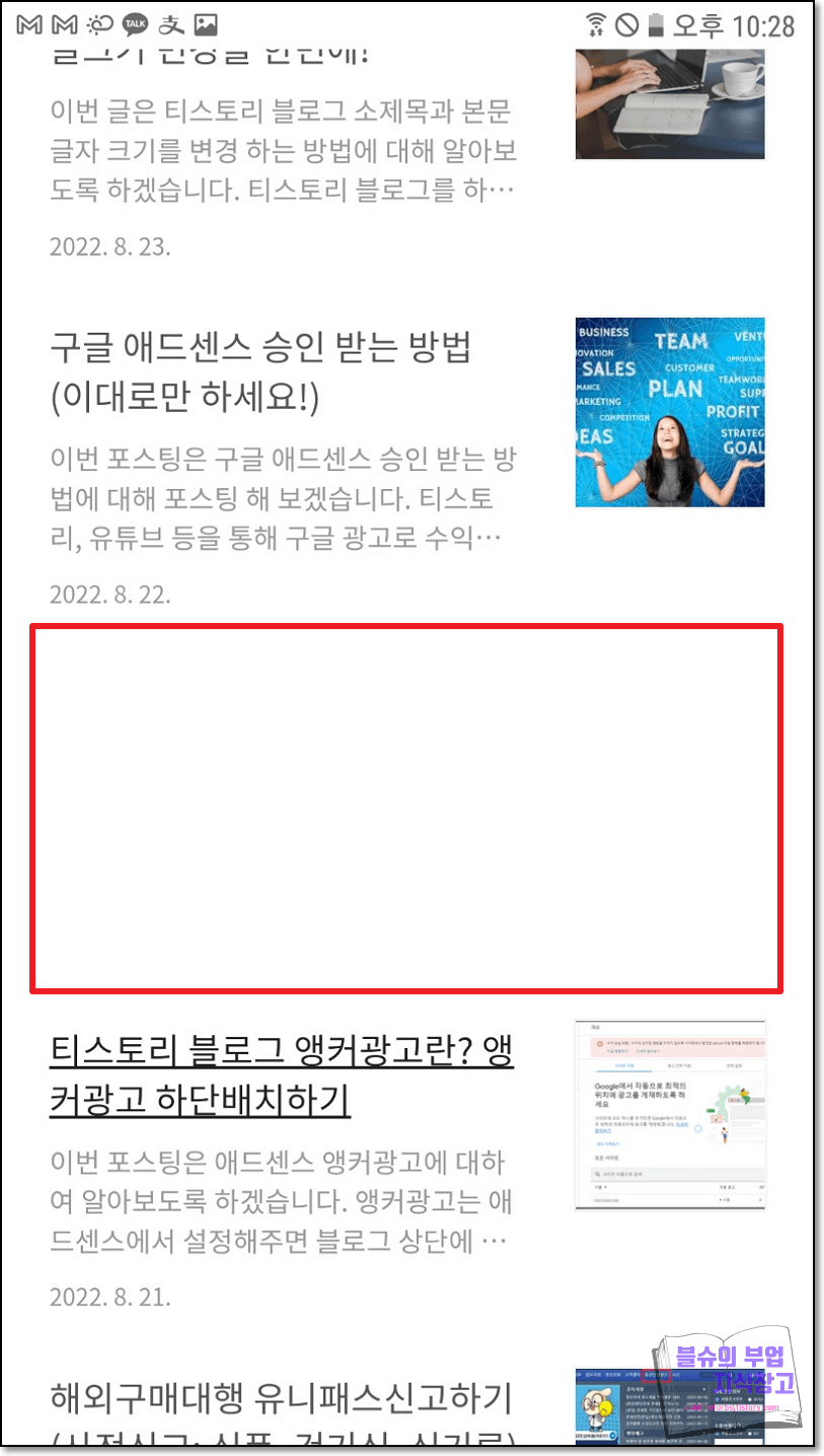 코드 삽입을 모두 해주고, 바로 모바일로 들어가 확인을 했는데, 본인 블로그로 들어갈 경우 이렇게 광고가 안뜨더라구요, 확인은 다음에 지인 폰으로 다시 확인 해 봐야 겠습니다. 아마 이 빈공간이 광고 자리 인 것 같네요!