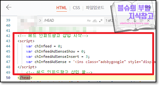 아래 빈공간 클릭 후 CTRL + F 를 눌러 검색창을 활성화 시키고, /head 로 검색 하여 그 바로 위에 1번 헤드 코드를 넣어줍니다.